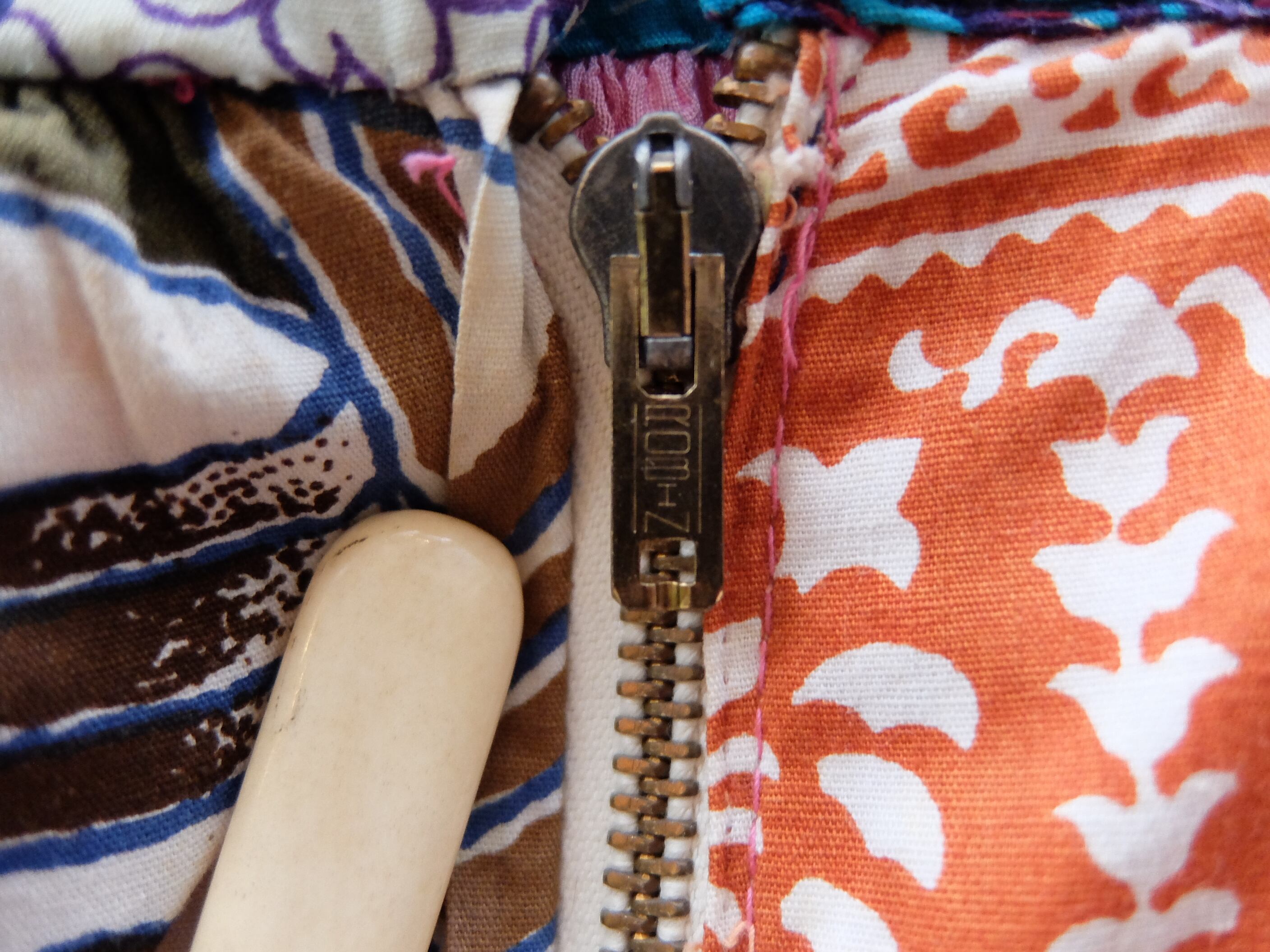 こちらの商品は、ウエストベルト後ろに生地のほつれがございます。ところどころに小さな細かいシミが点々とありますが、柄物なのであまり目立ちません。