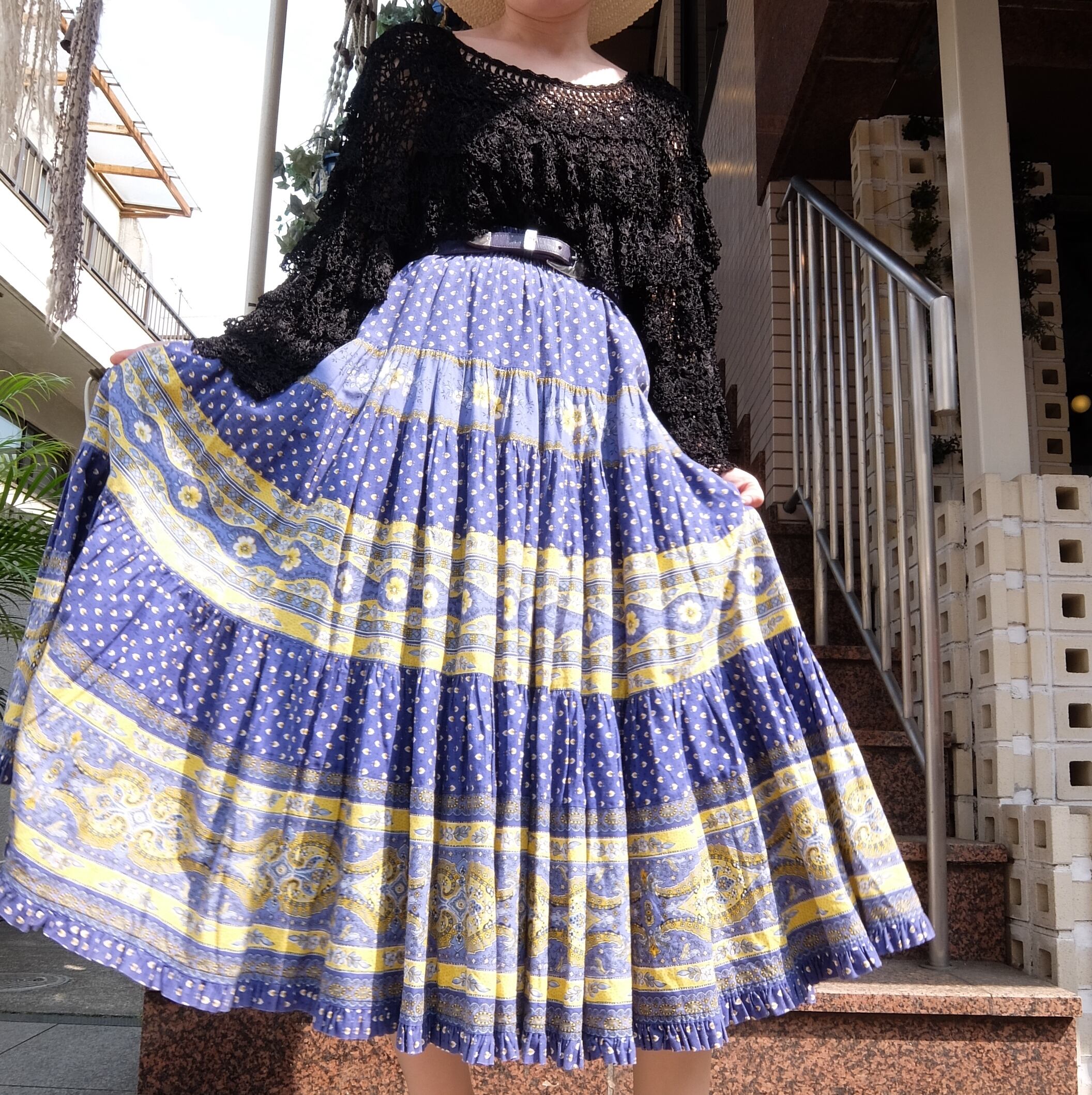 フランス製のプロバンススカートです。プロバンス地方の伝統的な染色技術で、南フランスの豊かな自然を色鮮やかにプリントしたコットン生地で作られています。近年希少になってきたアイテムの1つです。