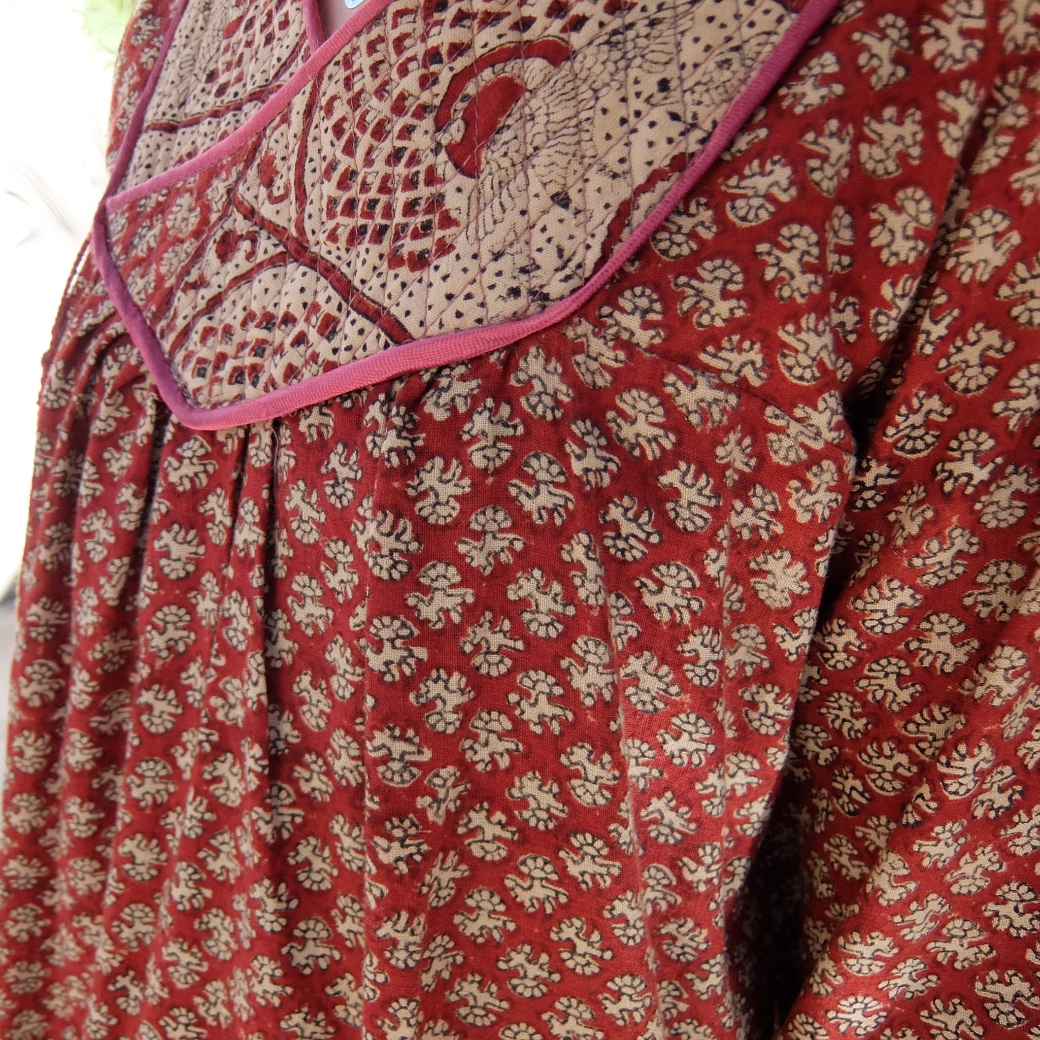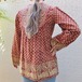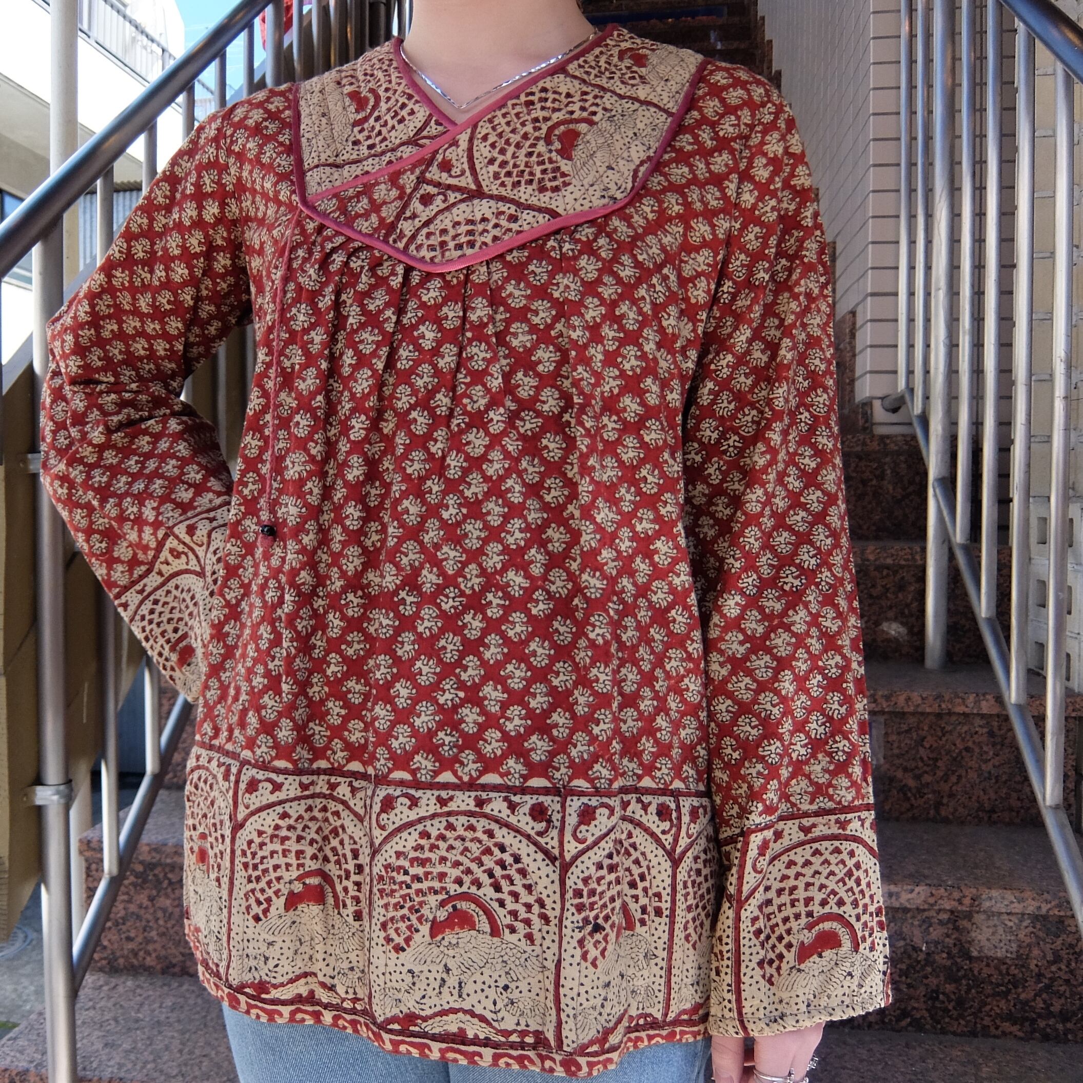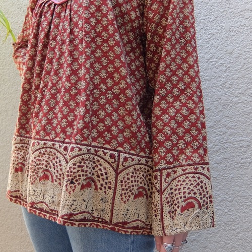 ヴィンテージインド綿は70年代のインドブームで、イギリスやフランスから広がりました。作られたのはインドで、ロンドンやパリのブランドの物が多くあります。ウッドストックなどのフェスが行われたサンフランシスコのブランドも有名です。ヒッピー達がフェスで着ている姿が想像出来ますね。ハンドブロックで幾重にもプリントされ、自然由来の染料からは独特の色味がでるのが魅力です。こちらはキルティング切り替えの型が珍しい、裾とデコルテにピーコックがハンドブロックされたチュニックです。