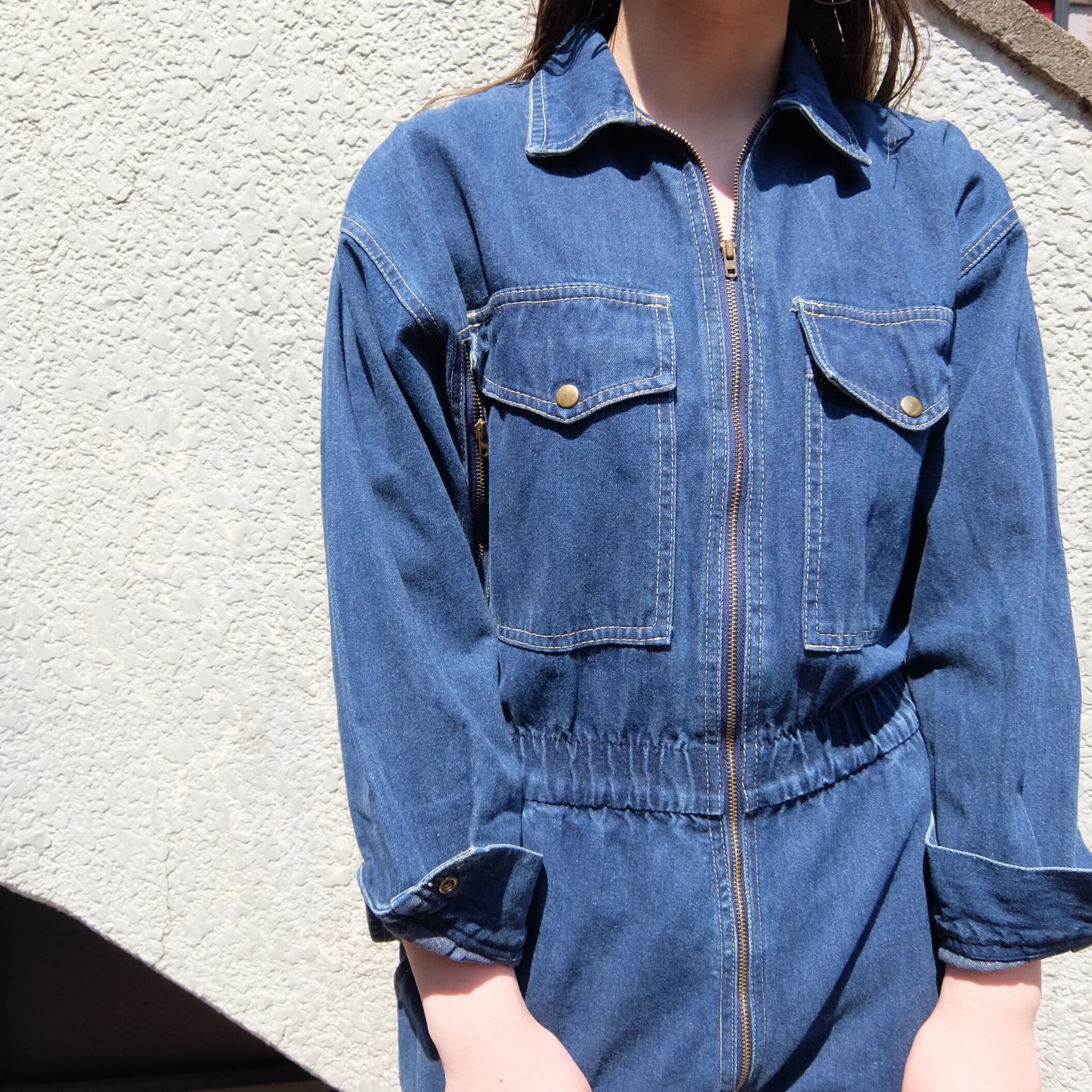 70~80年代頃の "サンジェルマン" デニムジャンプスーツです。パンツのテーパードシルエットが80年代らしい1着です。