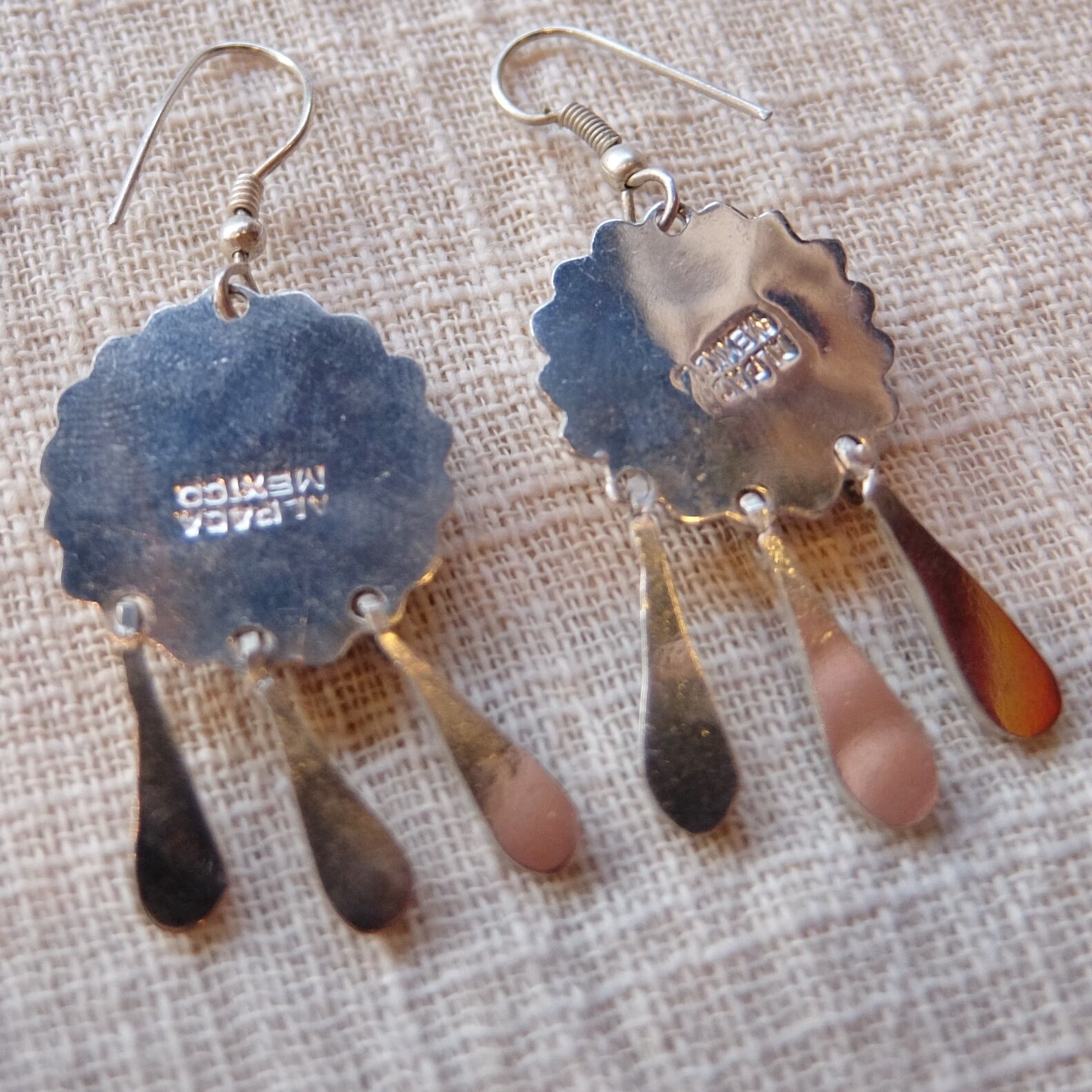 裏側に MEXICO ALPACA の刻印があります。海のお守りとも言われるアバロンシェルはアワビの貝の事で、滑らかな自然色の光沢が特徴です。ネィティブアメリカンの儀式では、この貝殻を受け皿にして浄化を行なわれています。天然の貝なので1つずつ違った模様になるのも魅力です。