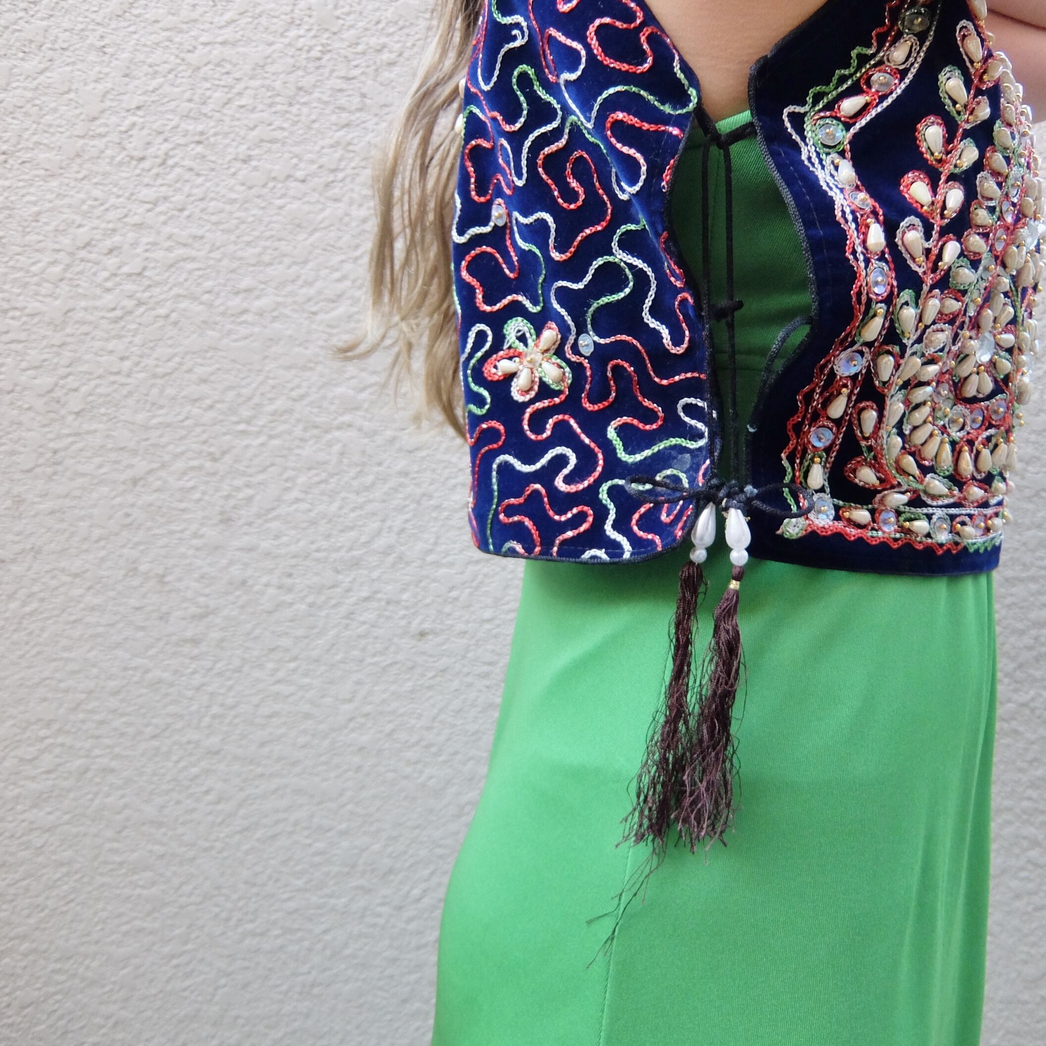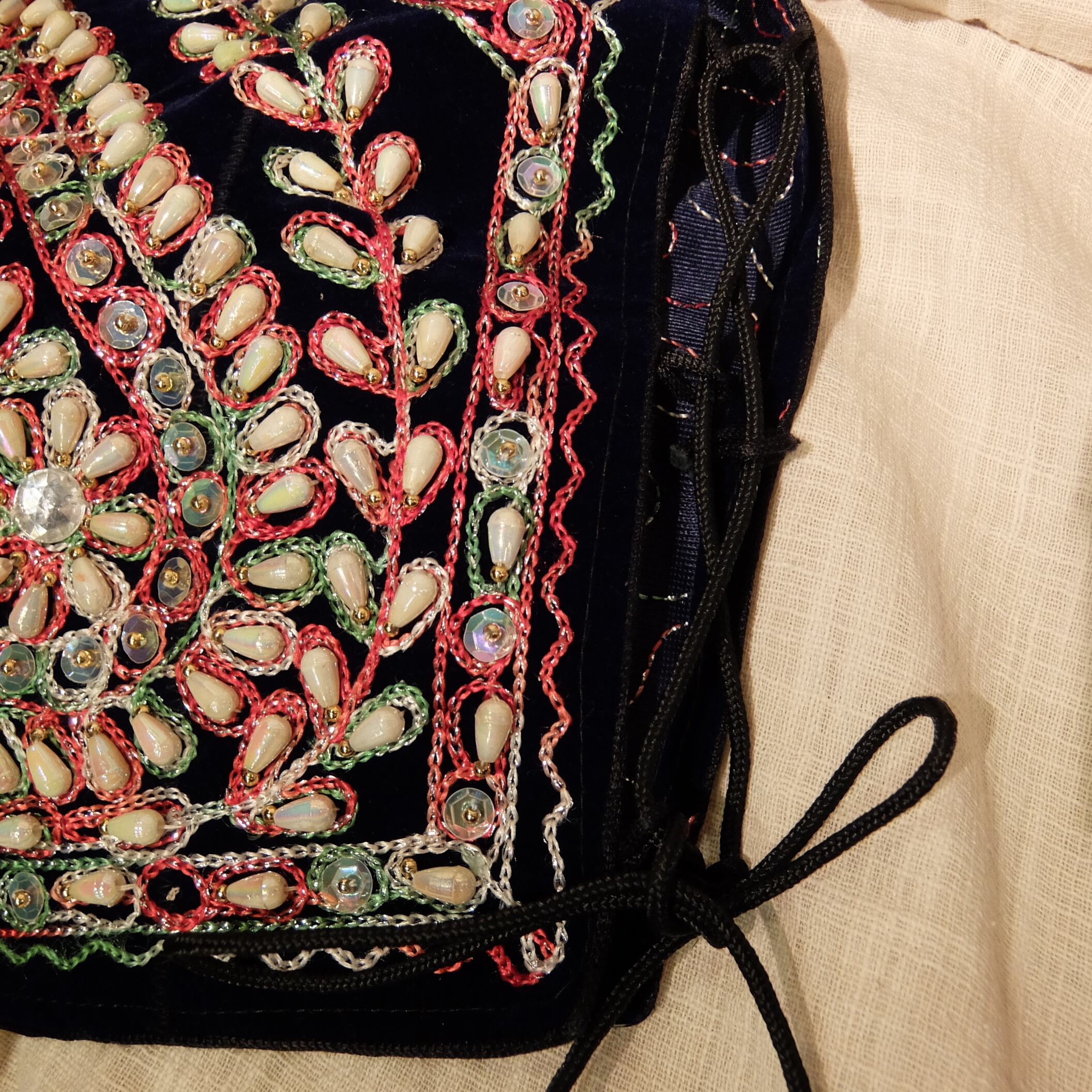 こちらの商品は脇の右側のヒモに切れている箇所があり、左右のヒモが異なります。スパンコールやビーズ、刺繍が取れている箇所がございます。
