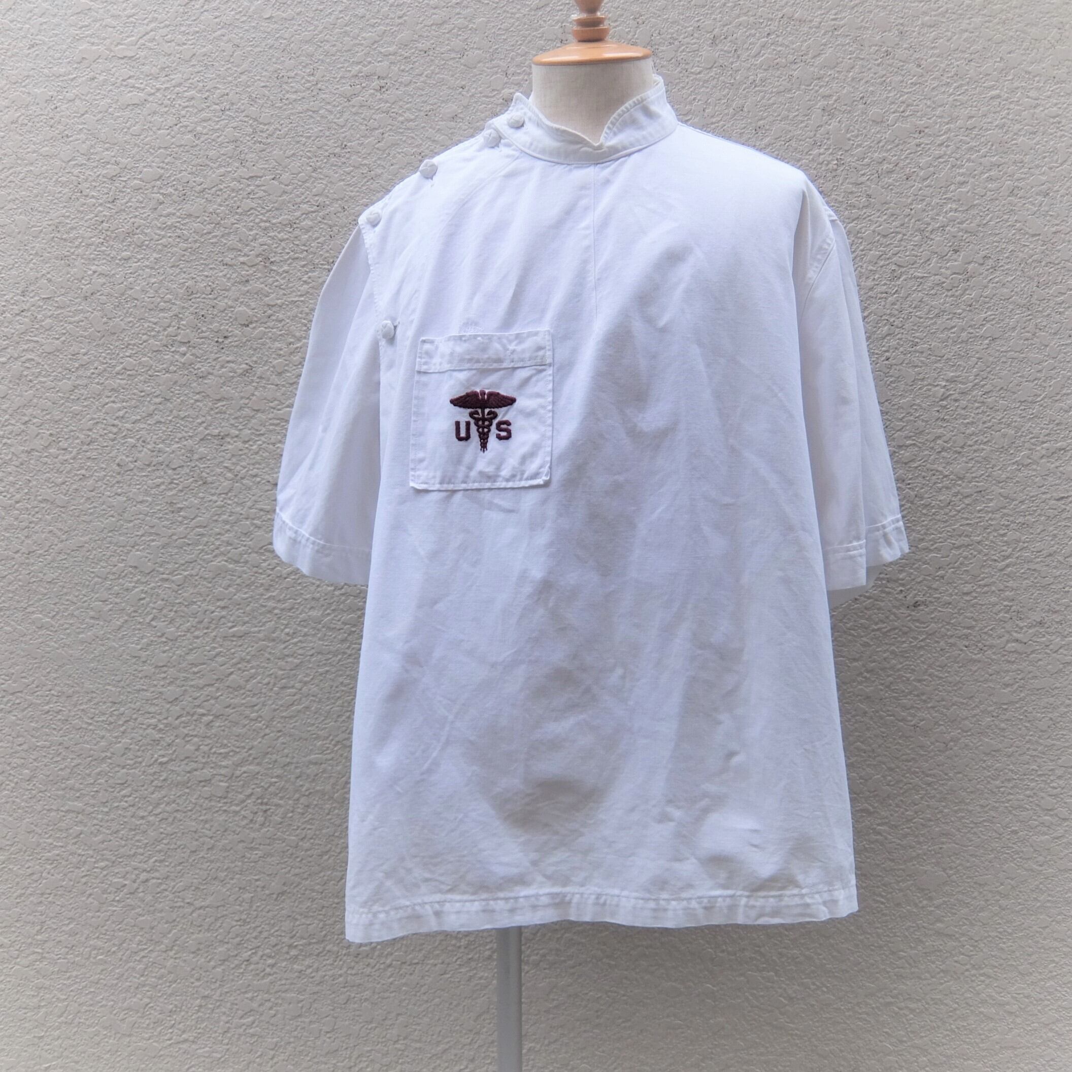 60年代以前のものと思われる軍医のシャツです。ポケットには紋章、腰にウエストベルトが付いています。