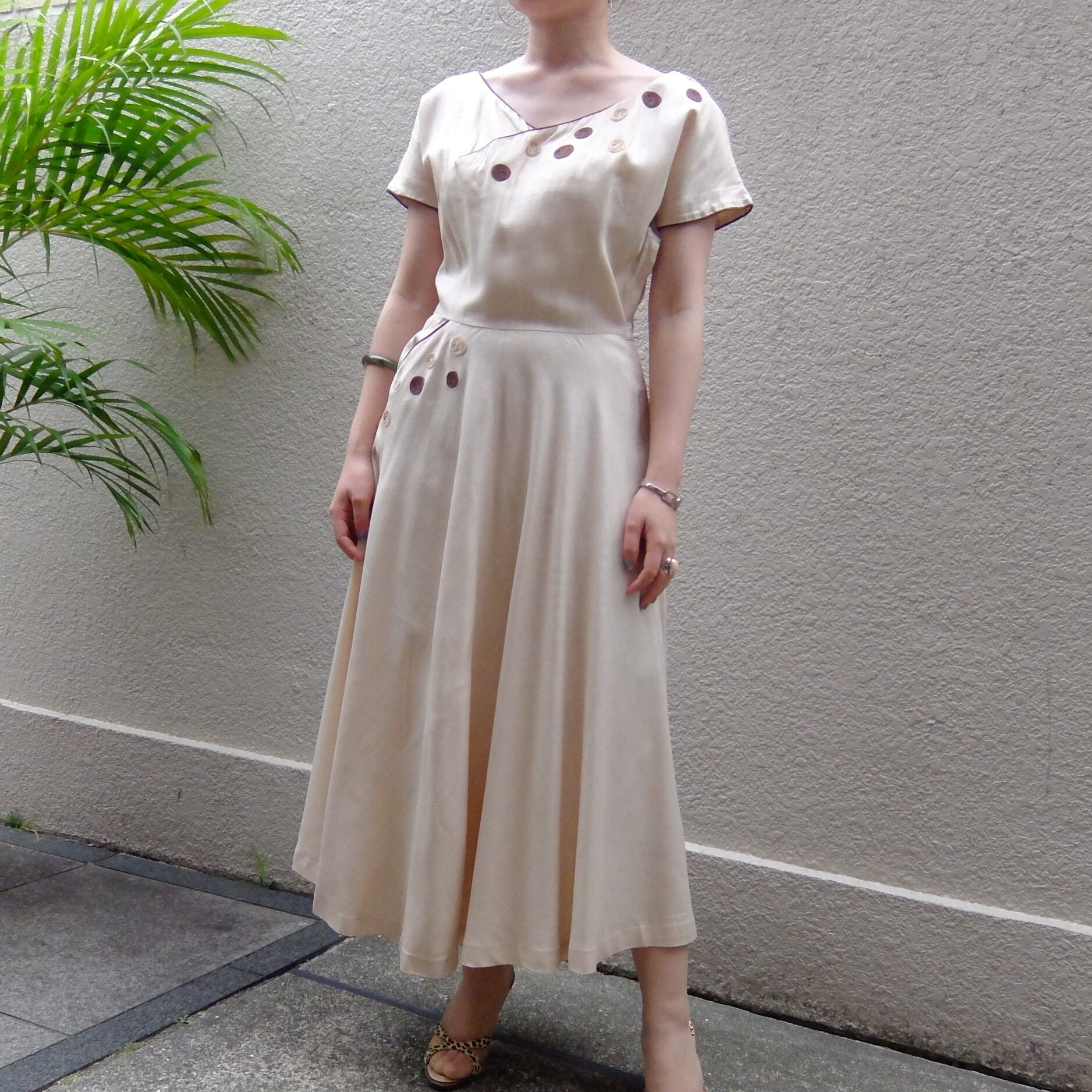 サークル刺繍のドット模様とパイピングかポイントの、シルエットがキレイなワンピースです。脇にポケット、ジップがございます。