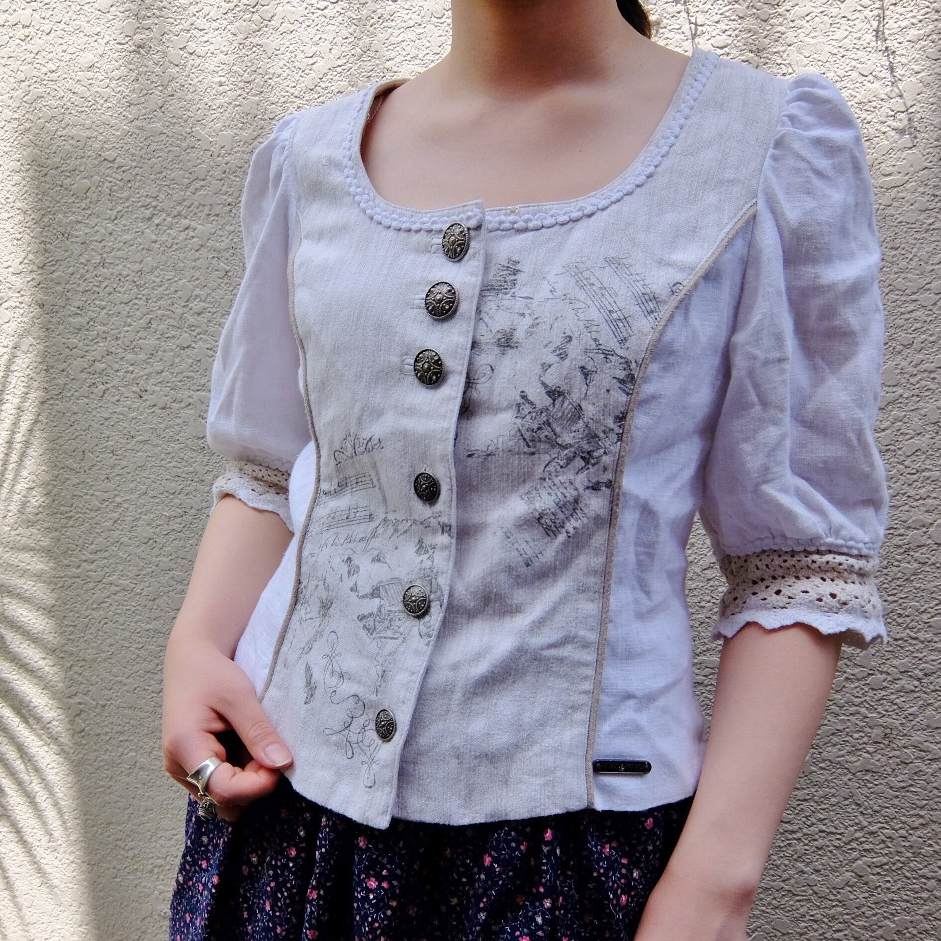 南ドイツ、オーストリアを中心とした地域伝統の民族衣装ディアンドルブラウスです。"Spieth & Wensky" のブランドの物です。近年ではオクトーバーフェスの影響もあり広く知られる様になったドイツの民族衣装ですが、花嫁衣装としても使われる可愛いらしいデザインです。スカートを合わせたカントリースタイルや、デニムパンツでカジュアルな合わせもおすすめです。