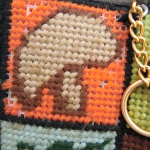 ニードルポイントとはキャンバス布の全体をひと目ずつ刺し埋める刺繍技法の事です。ウール糸を使うのでしっかりと厚みのある上品な仕上がりになります。当時キットとしての販売も多く、作る楽しみもあったようです。こちらのバッグは亀やさくらんぼなどカラフルポップな可愛らしいハンドバッグです。
