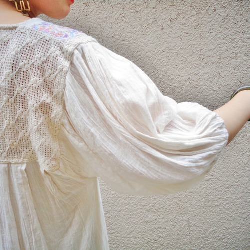 メキシコのサンアントニーノ村で作られる民族衣装です。村の身近な花や鳥が刺繍のモチーフで、一針一針手間隙かけて作られた一品です。鮮やかなカラーが多いサンアントニーノ刺繍ですが、こちらのワンピースはナチュラルな可愛らしいお色味です。