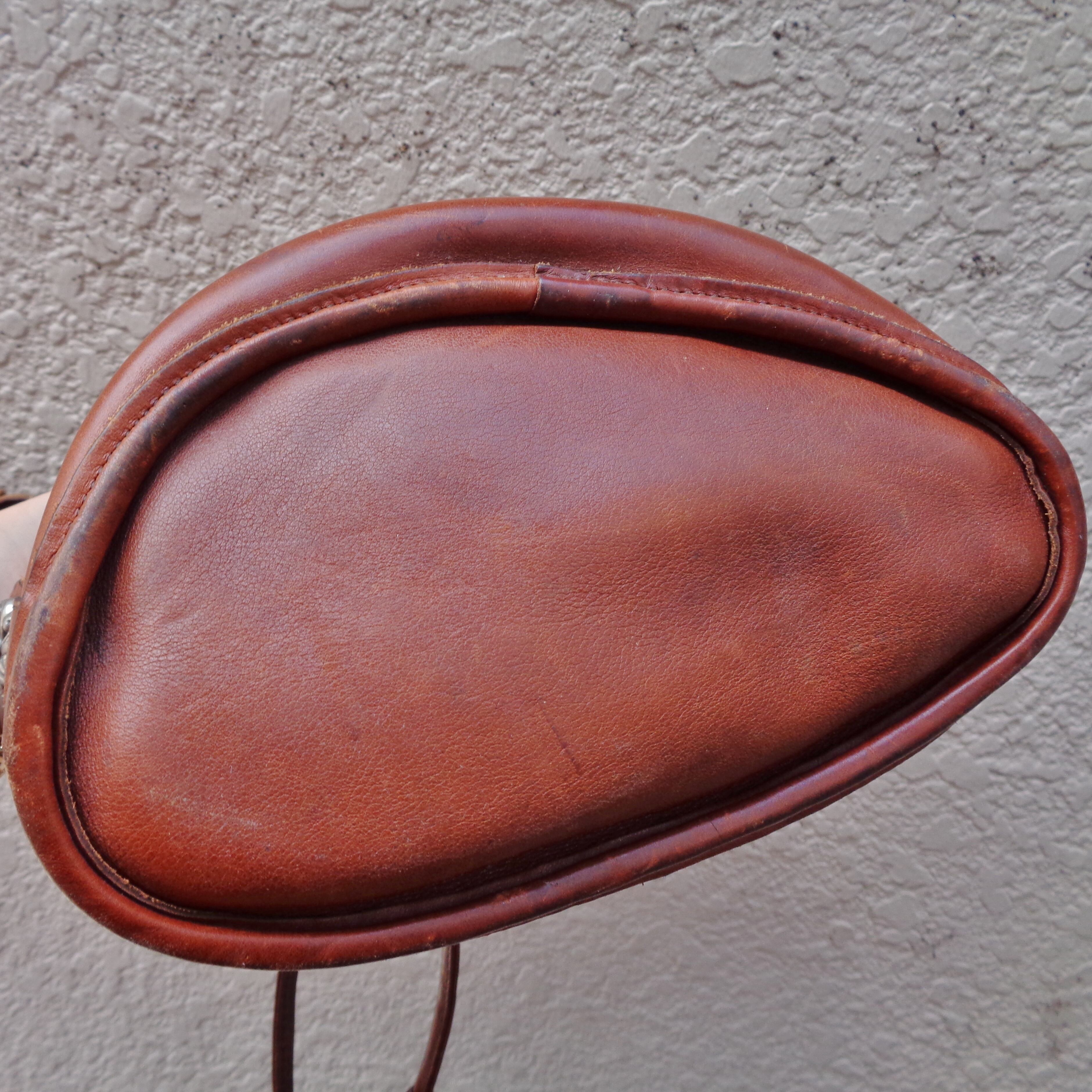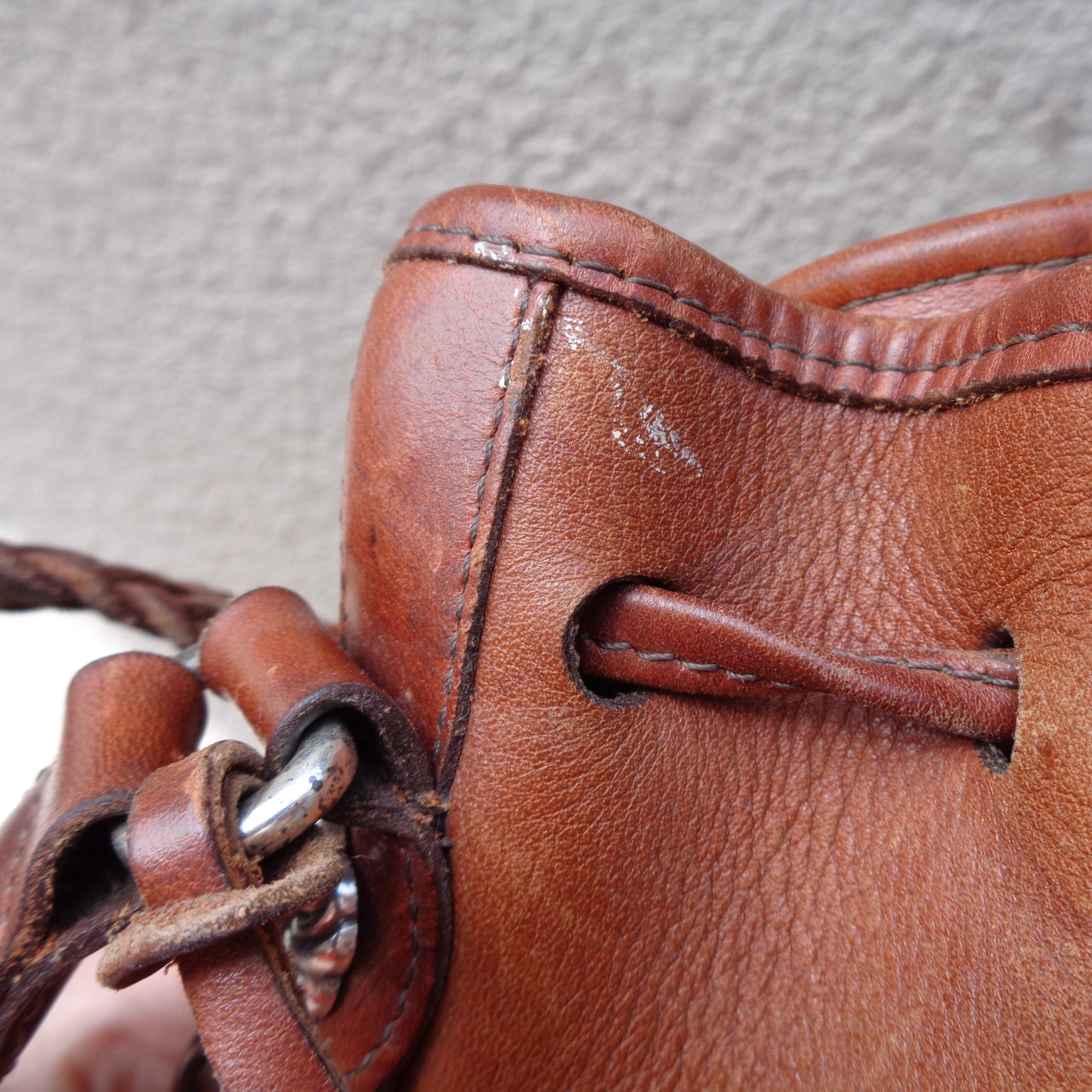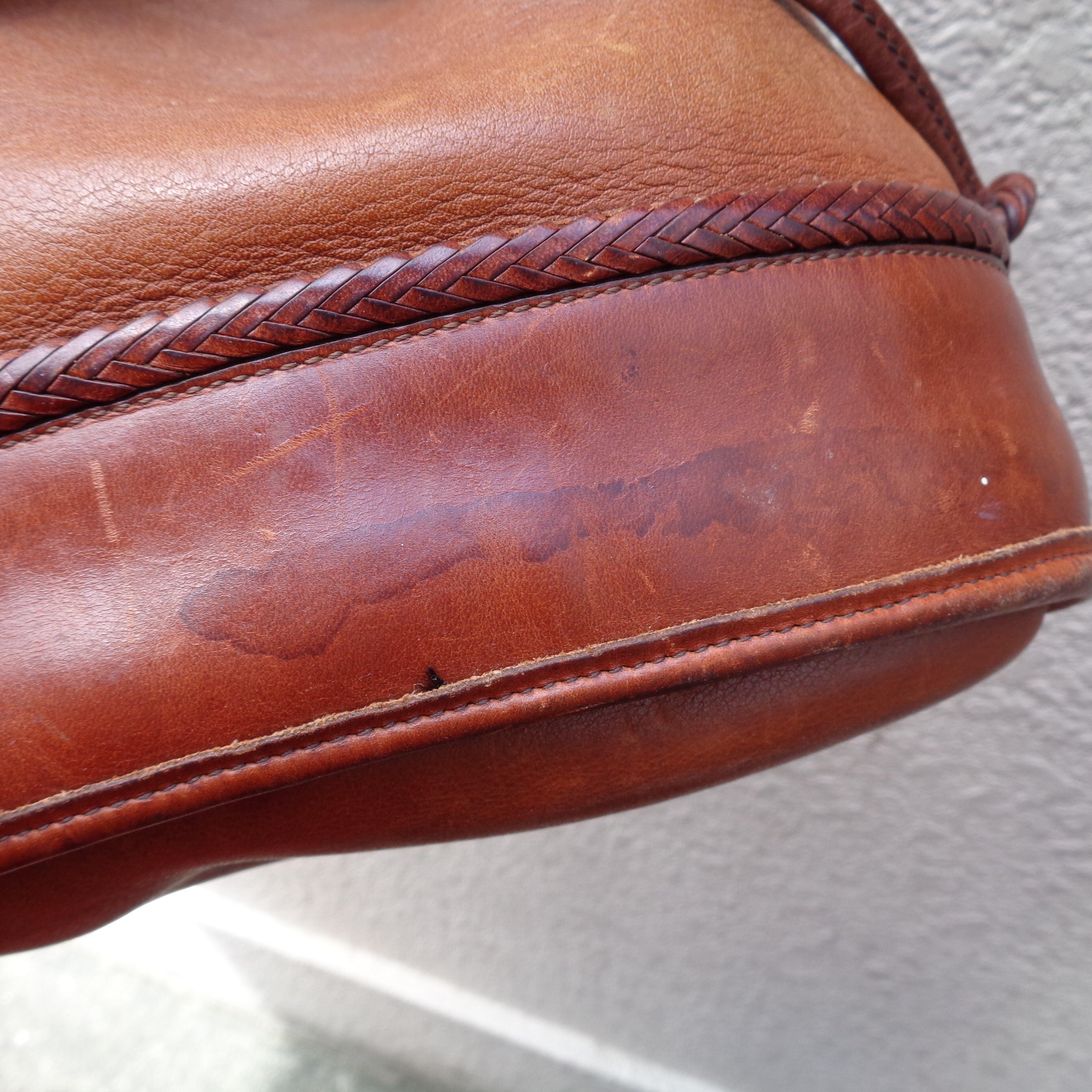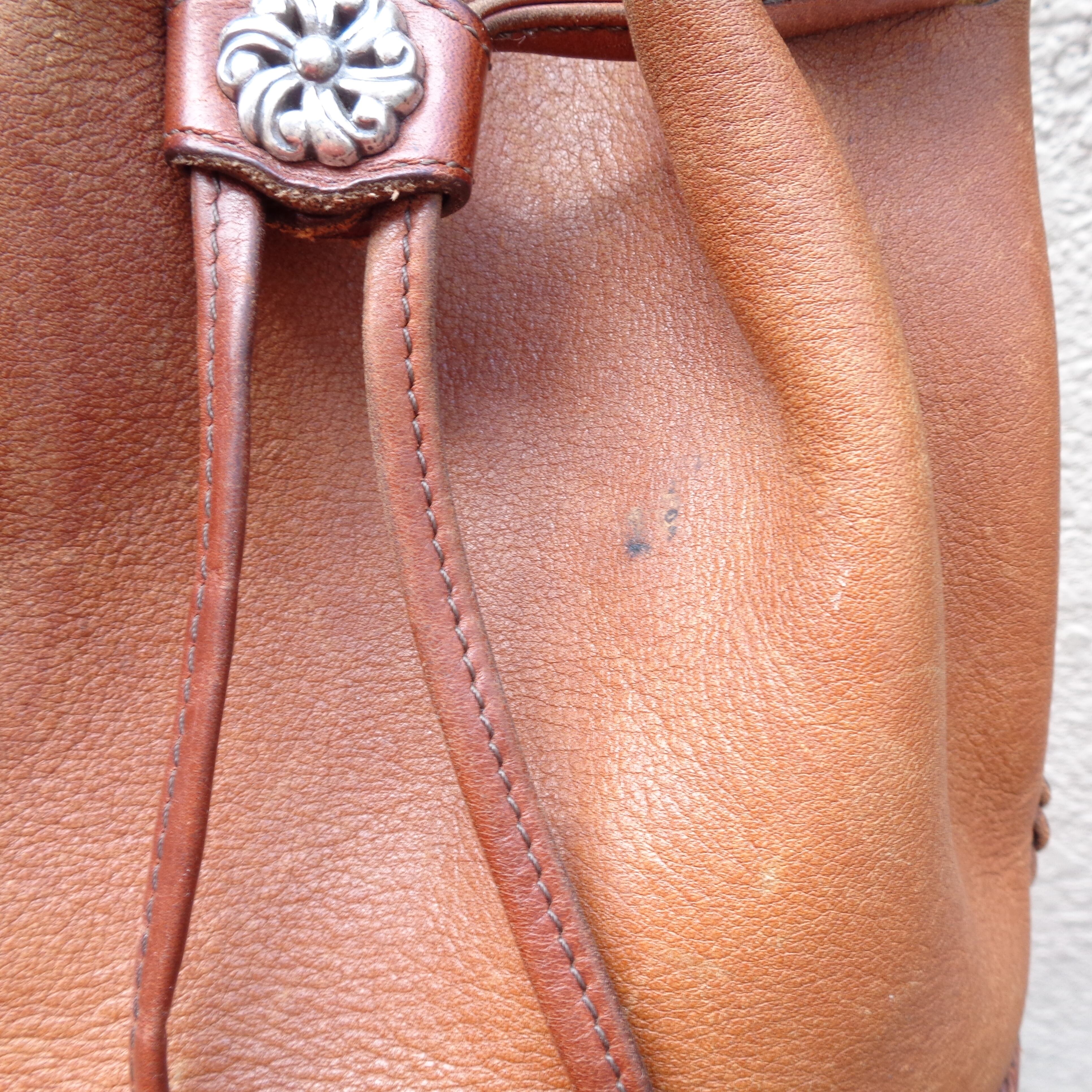 こちらの商品は全体的にレザーの使用感、金具に変色があります。下部、上部、真ん中、内側に汚れがございます。内側にはポケットが付いています。