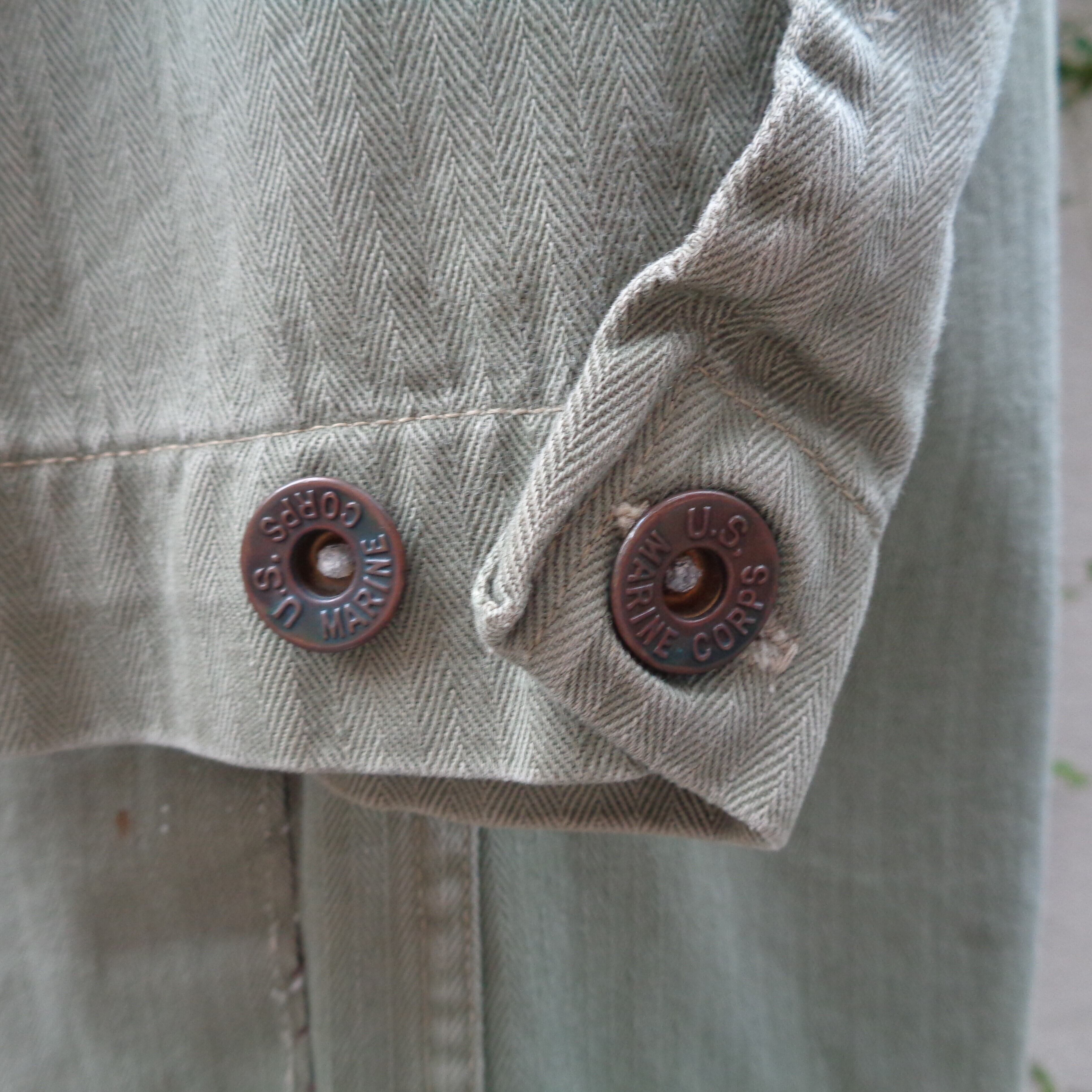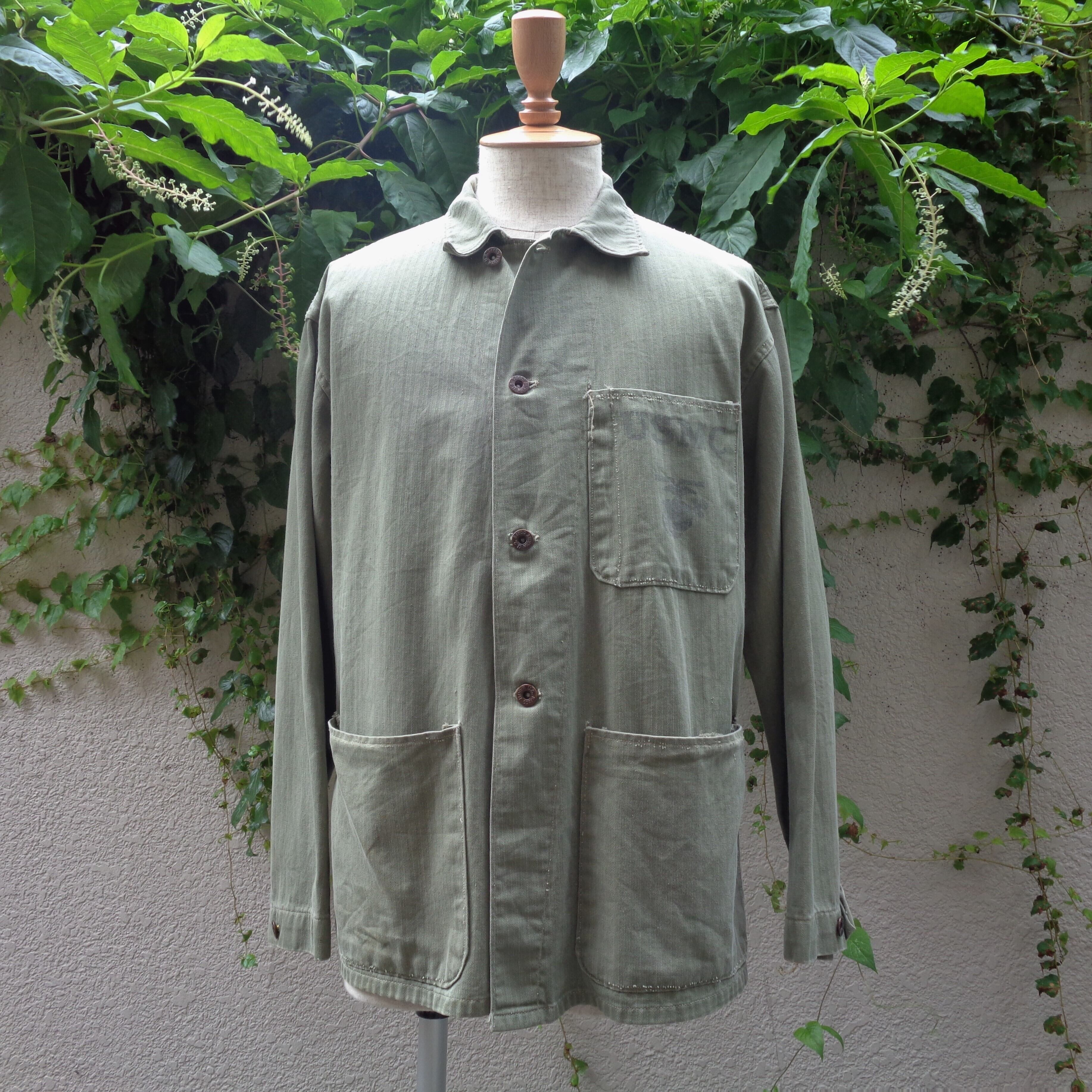 第二次世界大戦期、アメリカ海兵隊が作業用として使用していました。生地は耐久性のあるヘリンボーンツイルが使われています。USMCのロゴが入ったドーナツボタンは一つの欠損もなく、胸のステンシルもしっかり残っています。