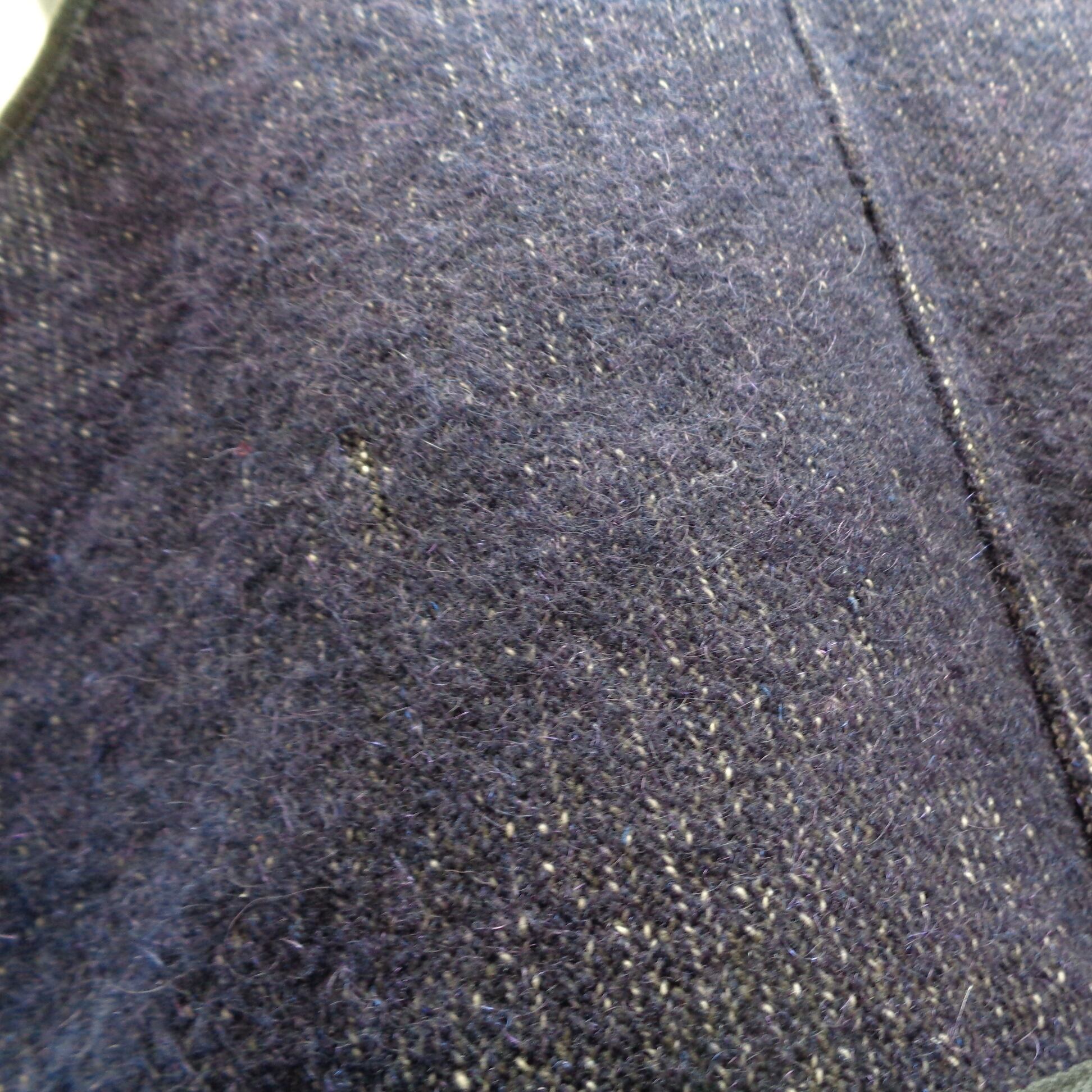 フロント首周りにダメージ、左下ポケットの角、一番下のボタンの横に2つ穴があります。