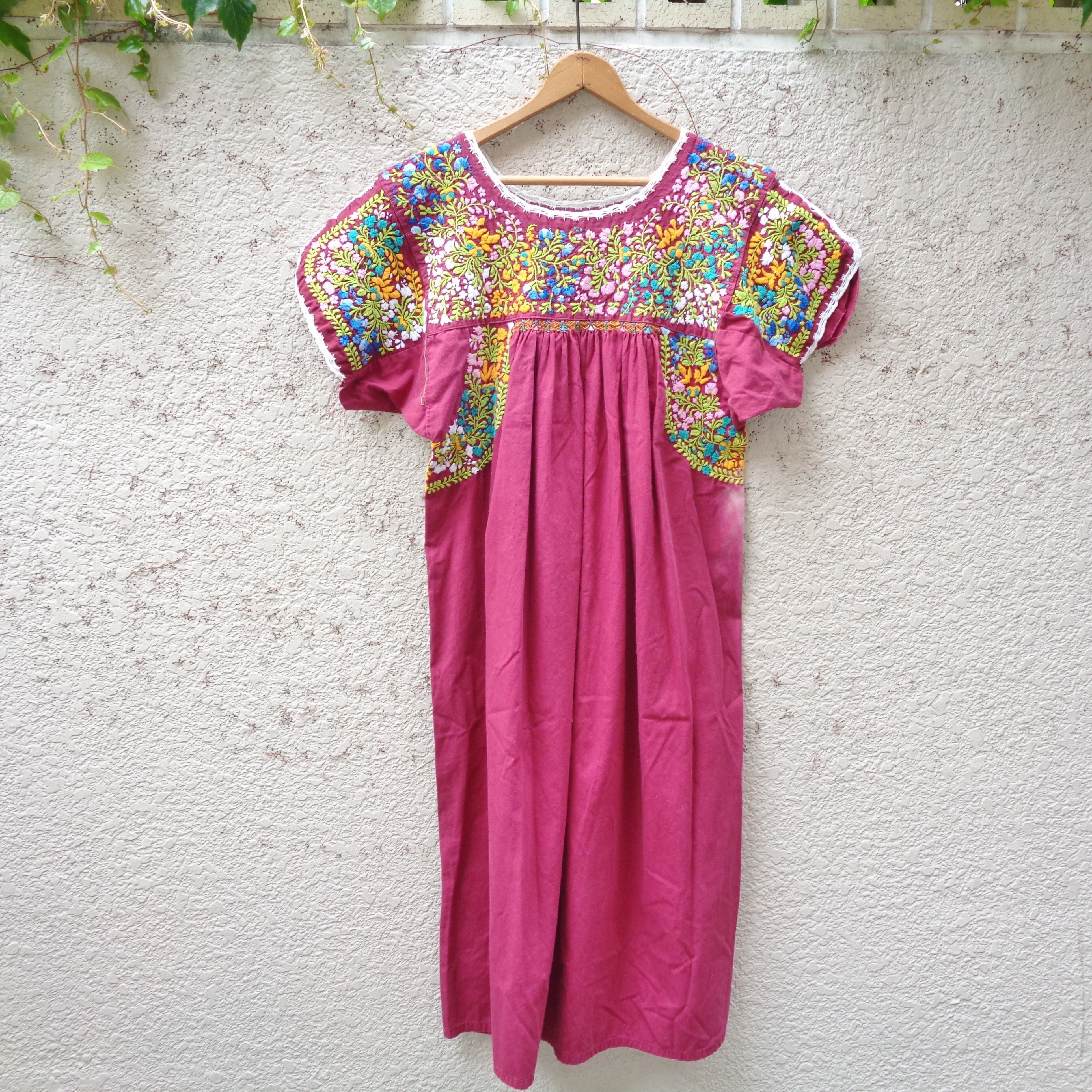 メキシコオアハカ州の伝統的なデザインのハンド刺繍のワンピースです。とても細かい刺繍なので刺繍部分を終えるのに数ヶ月かかる物もあるそうです。最高クオリティーのワンピースはかつて結婚式で着るための花嫁衣装でもあり、メキシコらしい色鮮やかな物が多いです。