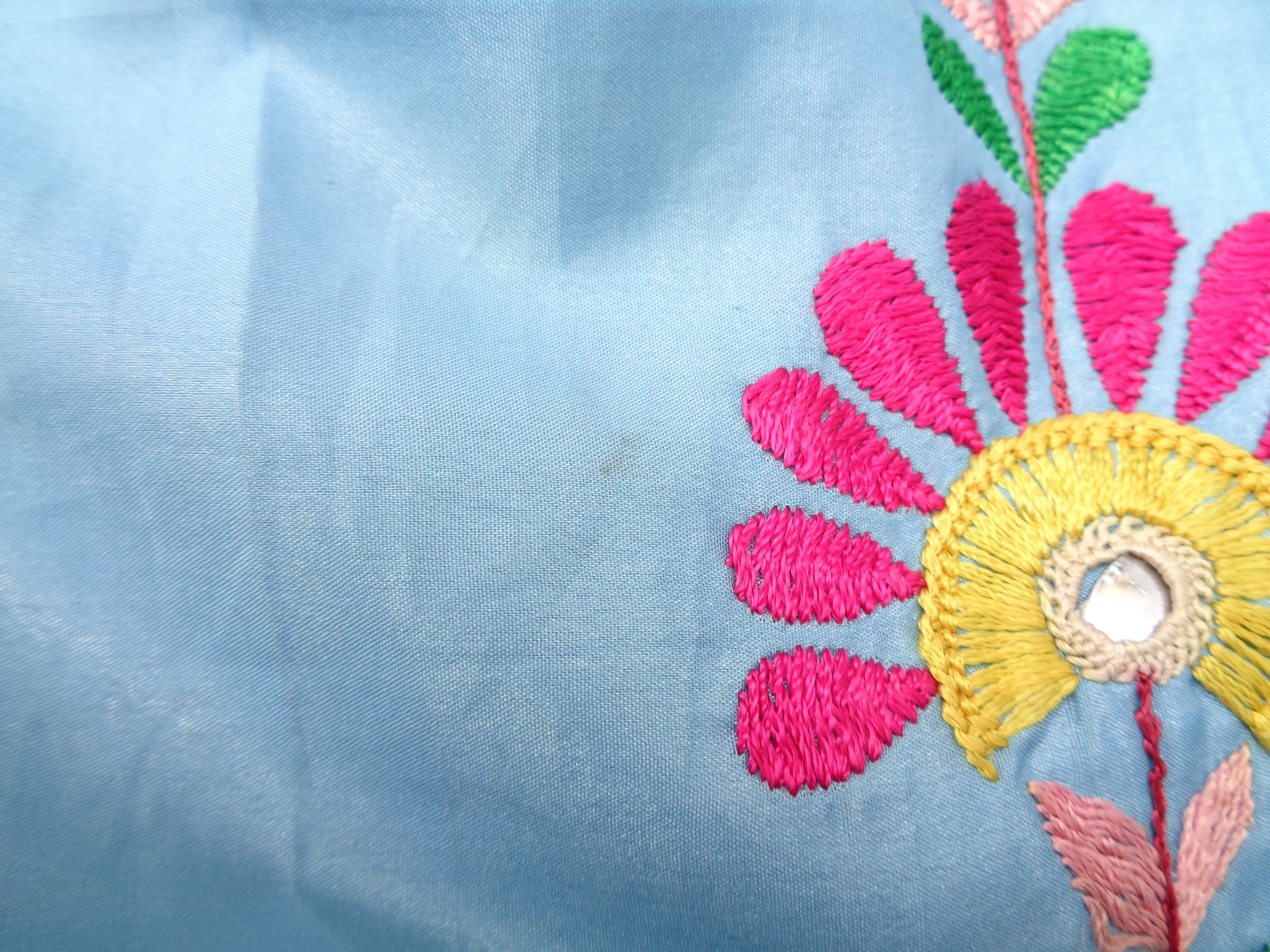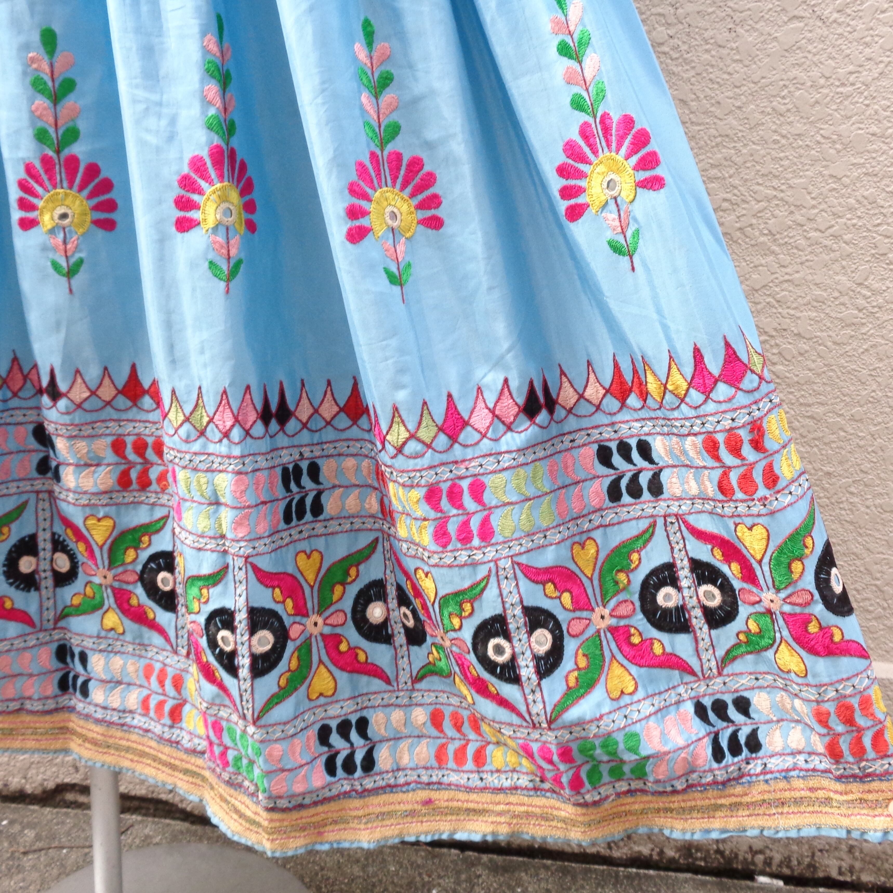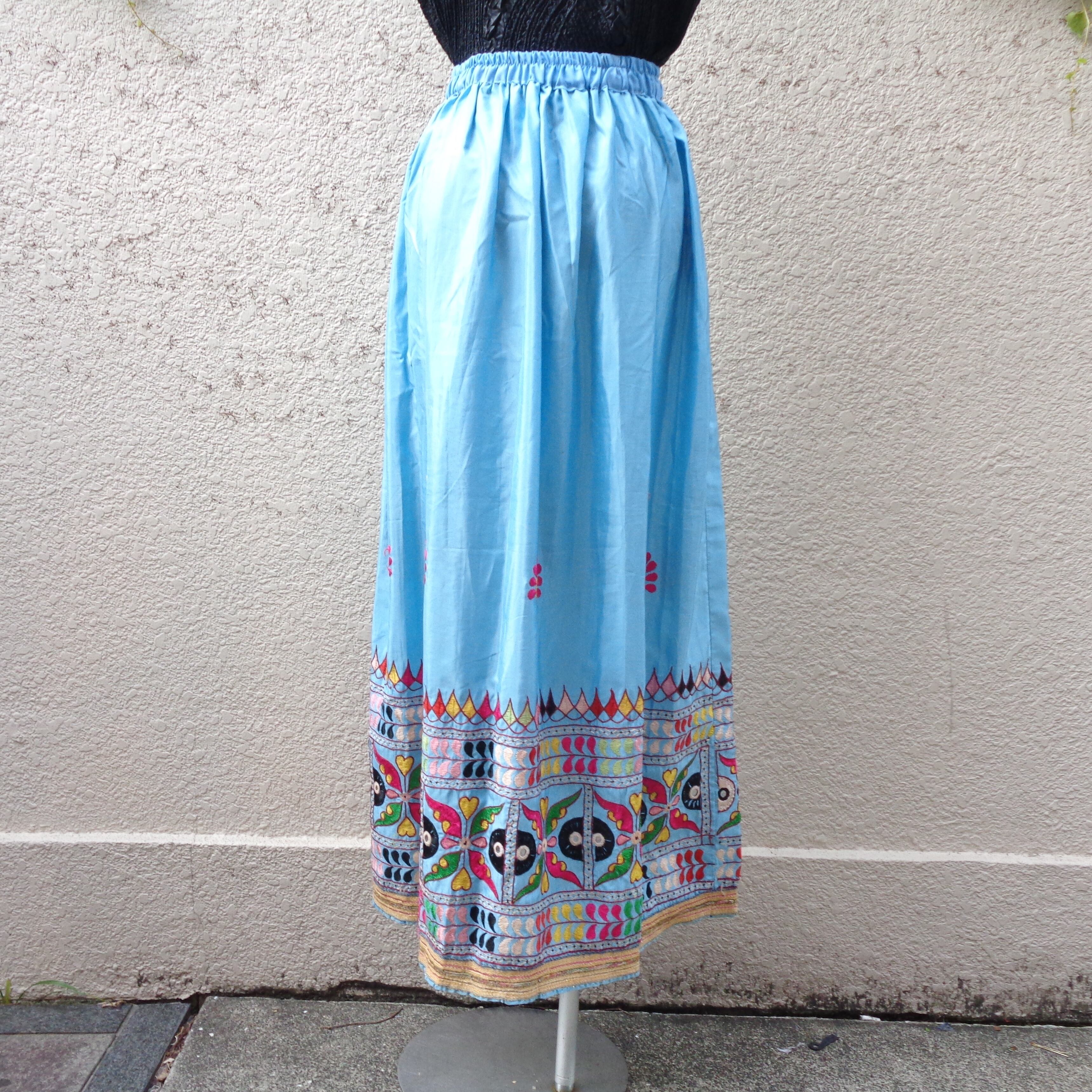 インド北西部に位置するラジャスタン州の刺繍が施されたロングスカート。あまり見かけないあわい色味なので、ブラウスやTシャツを合わせて可愛らしいコーディネートもしていただけます。