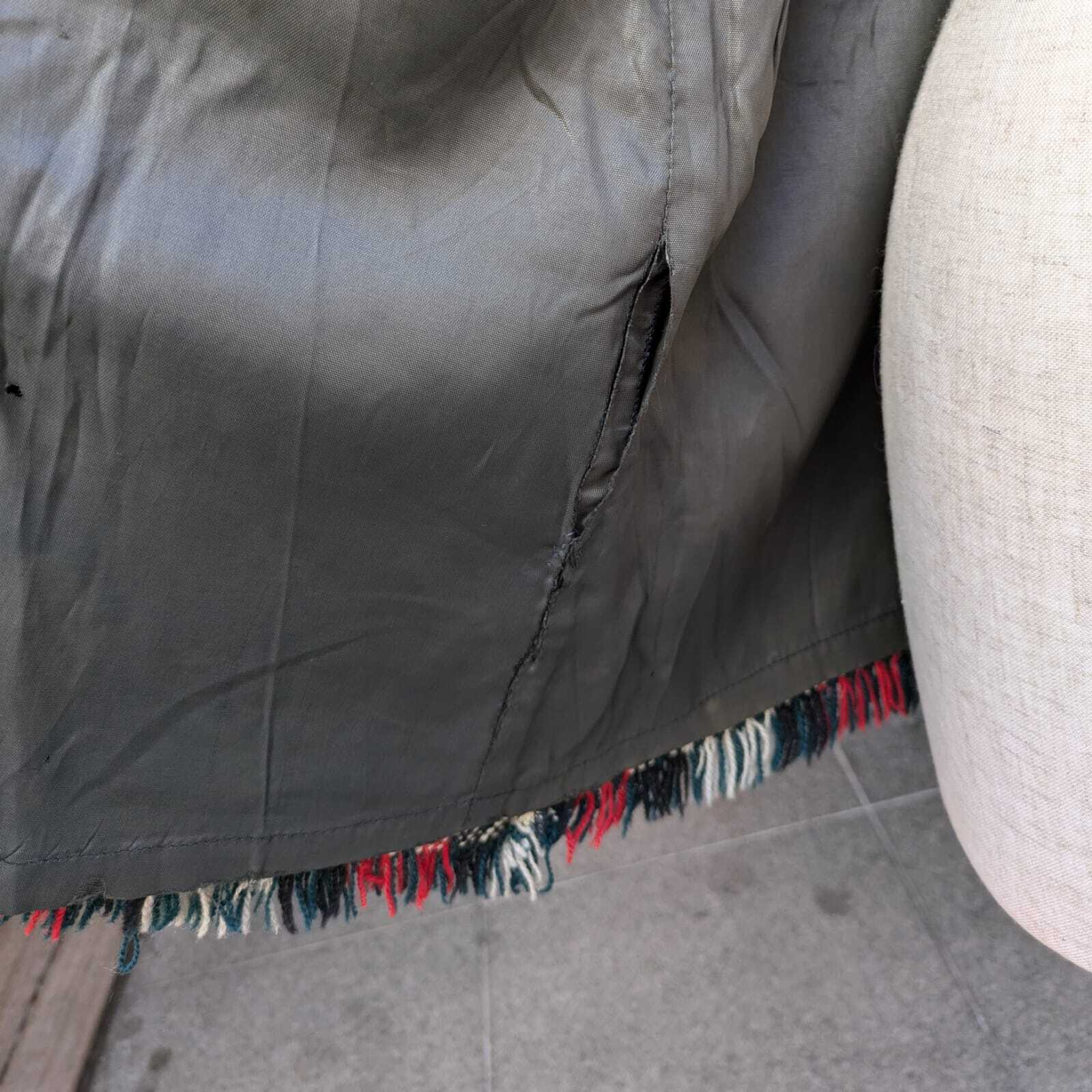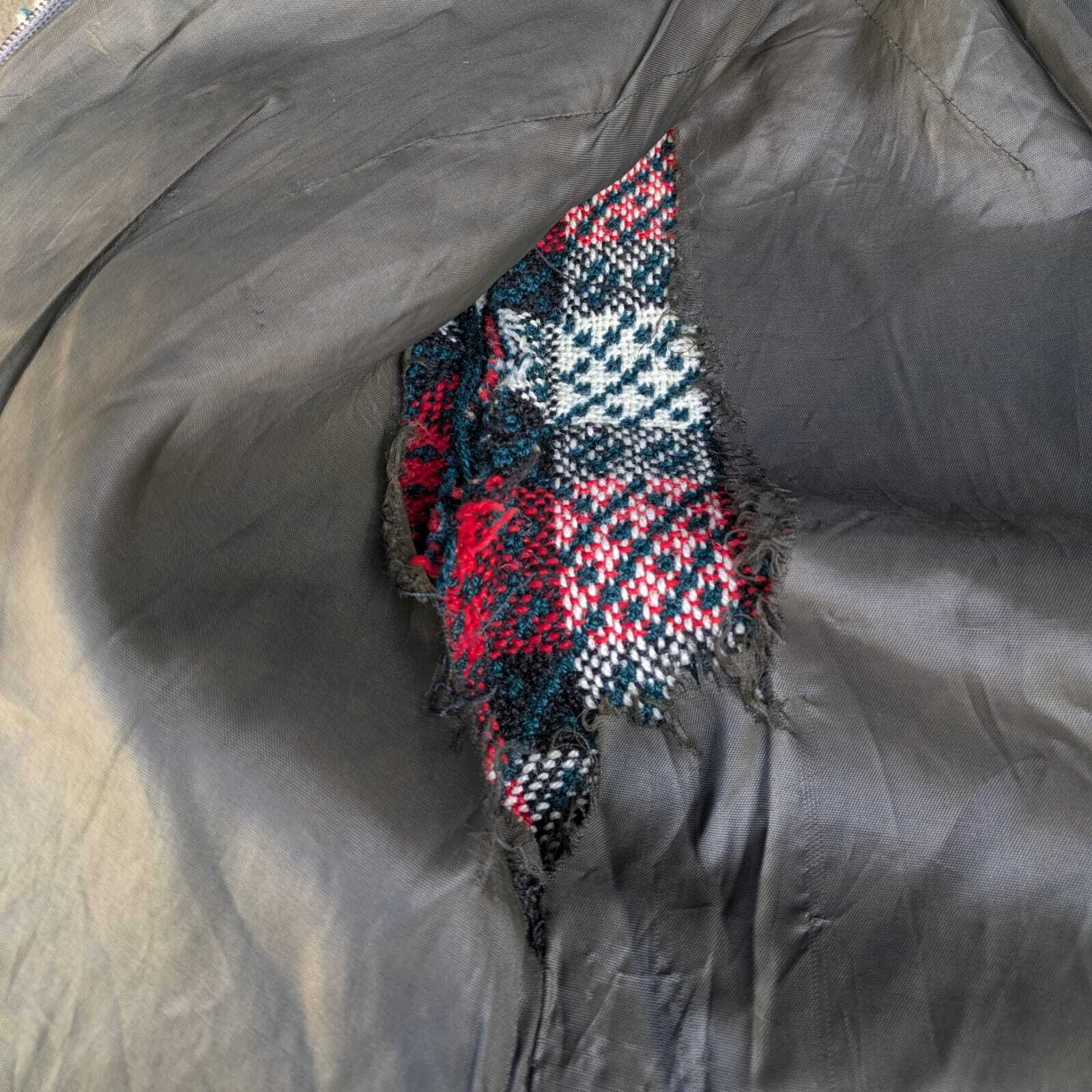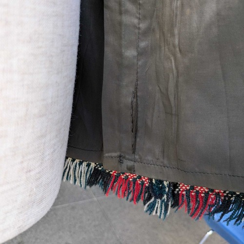 こちらの商品は、裏地脇部分に大きな穴と裏地横腹辺りの切り替え部分の裂けがございます。